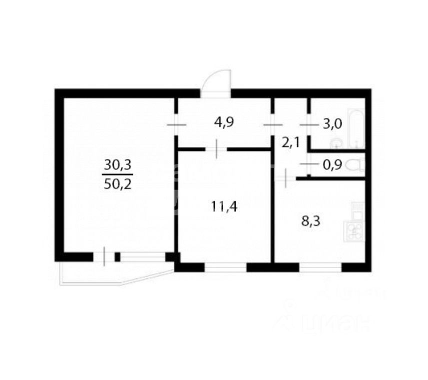 - Площадь: Общая — 51 кв. м. Просторная жилая зона — 25 кв. м, комнаты 30.3 и 11.4 кв. м. и светлая кухня — 8 кв. м.