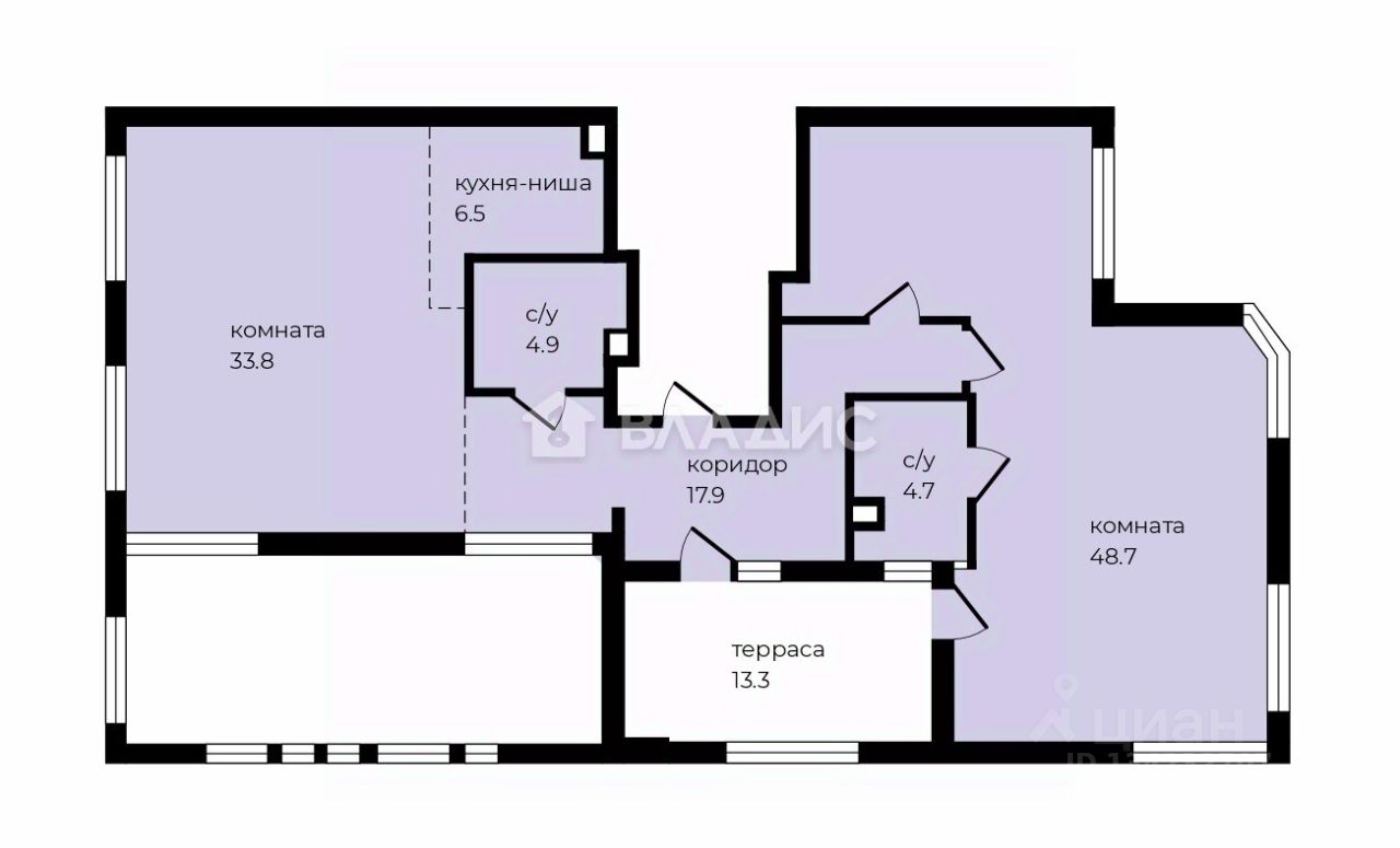 Объект с нестандартной, cвободной планировкой: коридор 17,9 кв.м, кухня 6,5 кв.м, 2 спальные комнаты 48,7 и 33,8 кв.м с выходом на закрытую террасу 13.3 кв.м; 2 совмещенных санузла 4,7 и 4,9 кв.м.