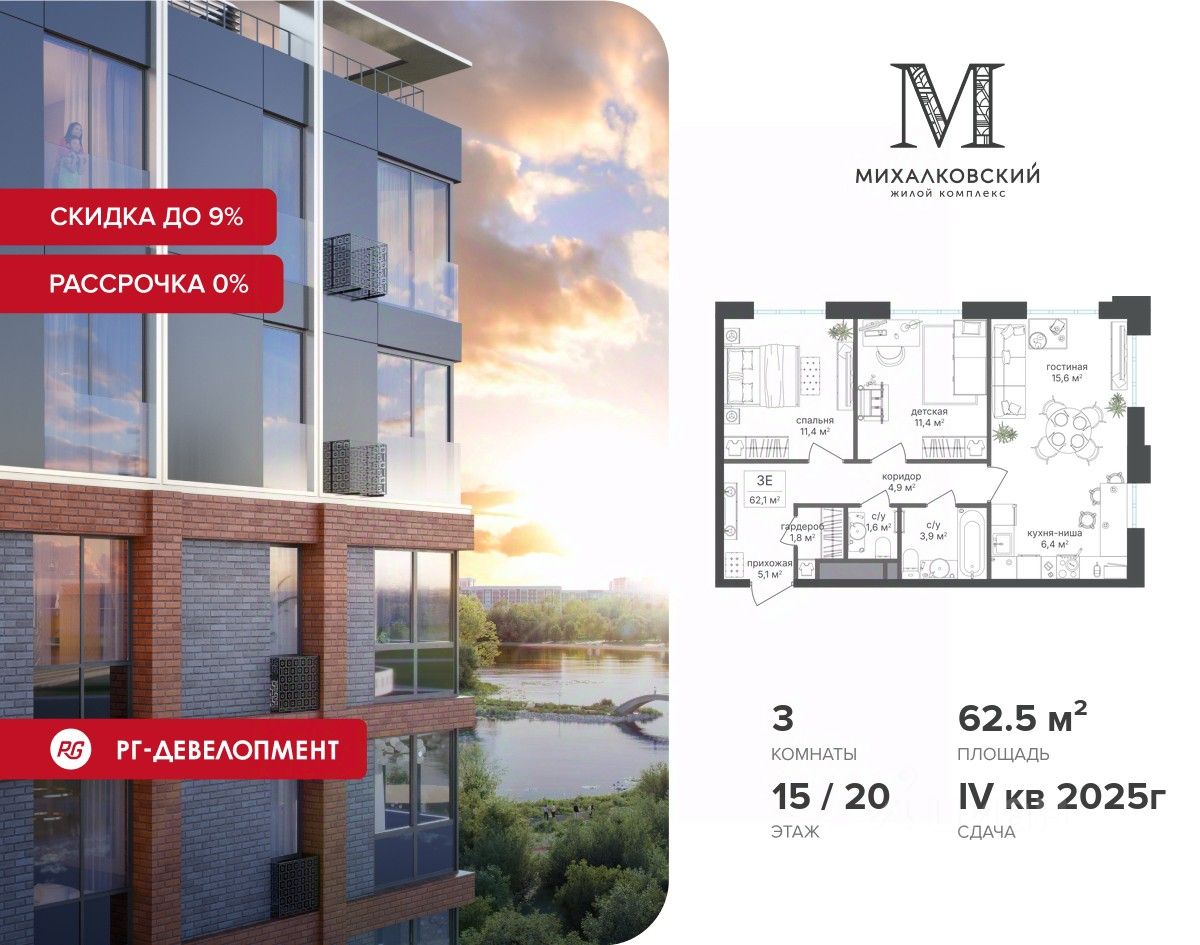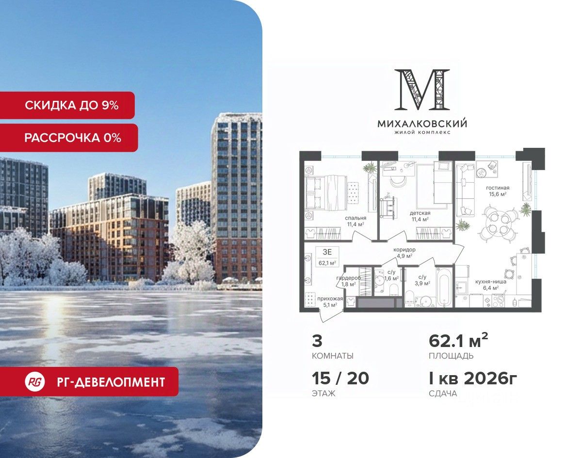 Продаётся 3-к квартира 62,5 кв.м. в ЖК "Михалковский" на 15-м этаже 20 этажного дома.