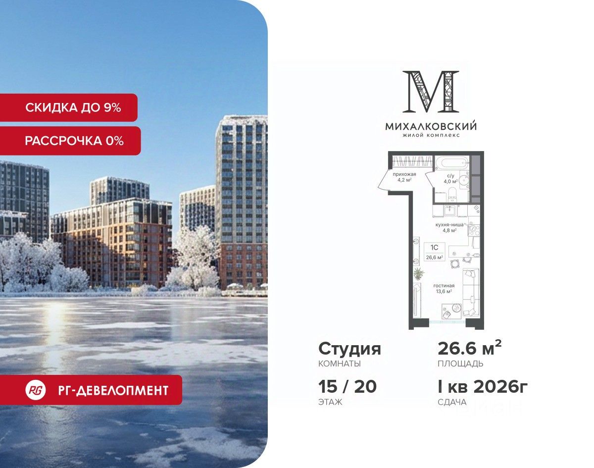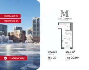 Продаётся студия 26,7 кв.м. в ЖК "Михалковский" на 15-м этаже 20 этажного дома.