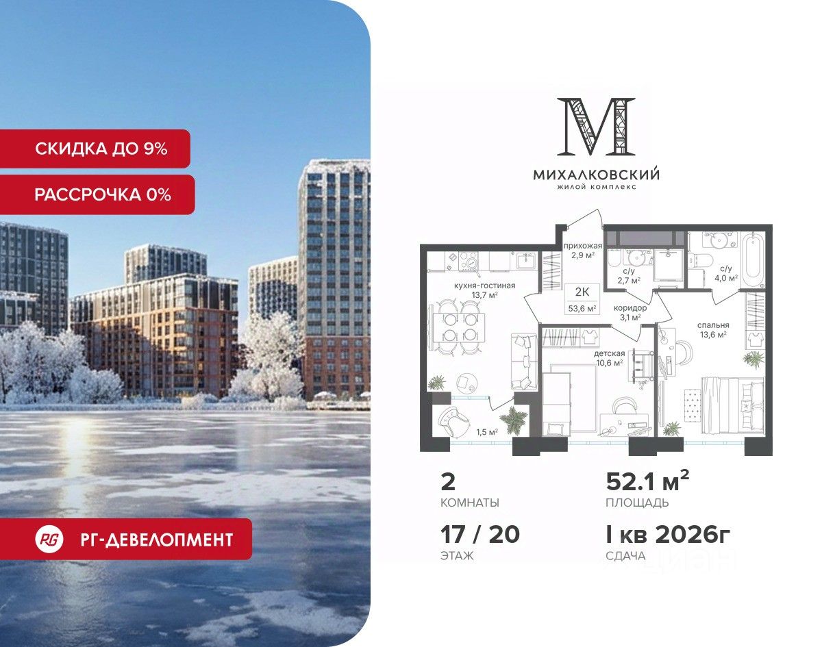 Продаётся 2-к квартира 52,6 кв.м. в ЖК "Михалковский" на 17-м этаже 20 этажного дома.
