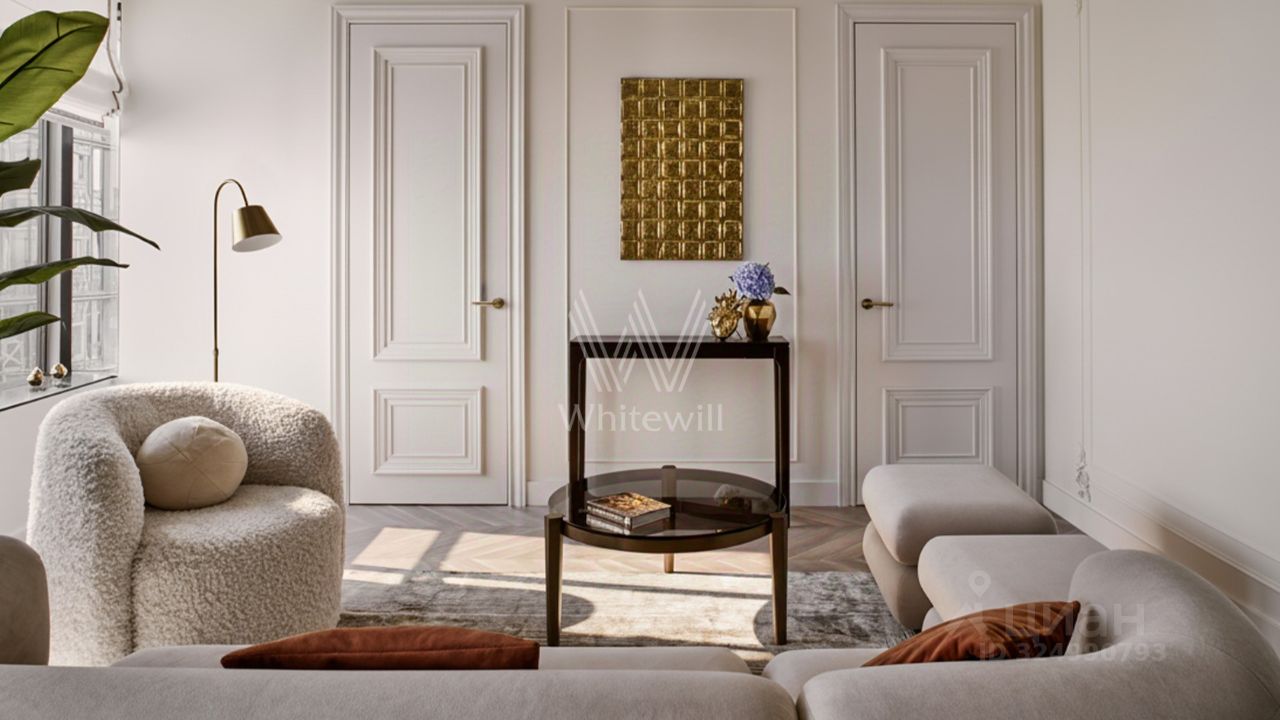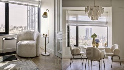 Функциональная планировка включает просторную кухню-гостиную с обеденной зоной и лаунжем, мастер-спальню с собственной ванной, детскую спальню, гостевой санузел и холл со встроенными шкафами для одежды. Благодаря панорамному остеклению пространство наполнено светом и теплом, открываются виды на город и деловой центр "Москва-Сити".