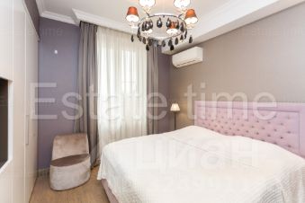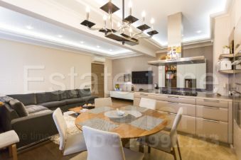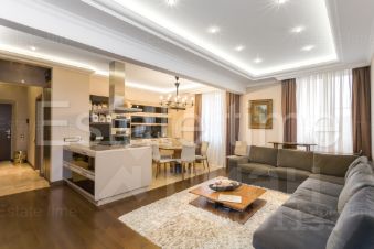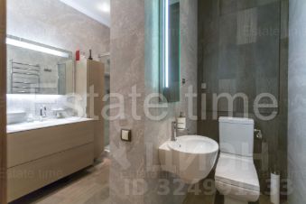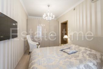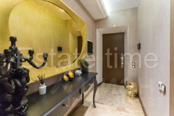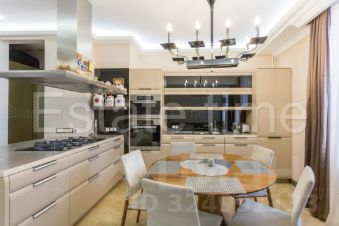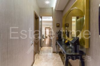 Полы дубовые, на кухне и в прихожей травертин, деревянные стеклопакеты, подоконники камень, шелковые обои. Санузел совмещенный, душевая кабина, полки и зеркала в ванной Antonio Lupi, сантехника Villeroy& Boch, плитка Devon & Devon. Две спальни.