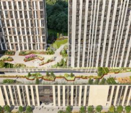 Закрытый двор-парк, который расположился на крыше стилобата. На высоте шестого этажа организовано обширное пространство для досуга, отдыха и занятий спортом.