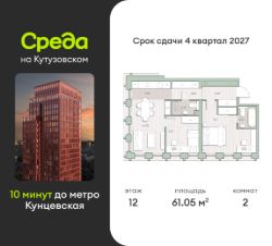 Продаётся 2-комнатная квартира общей площадью 61.05 кв.м. с отделкой white box. Квартира расположена на 12 этаже корпуса 4.1 в жилом комплексе бизнес-класса "Среда на Кутузовском" в пешей доступности от метро "Кунцевская".