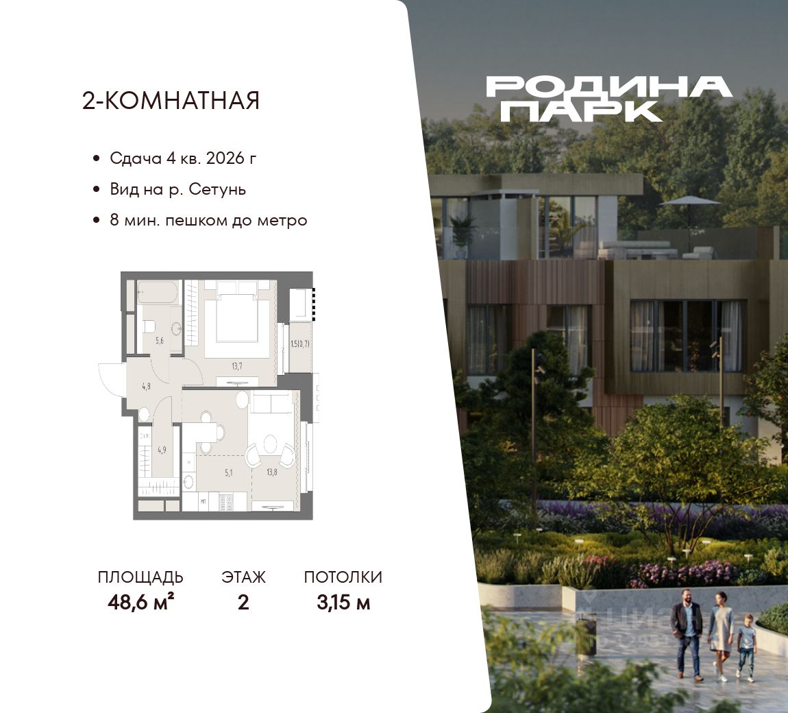 В жилом кластере Родина Парк рядом с природным заказником Долина реки Сетунь продаётся 2-комнатная квартира.