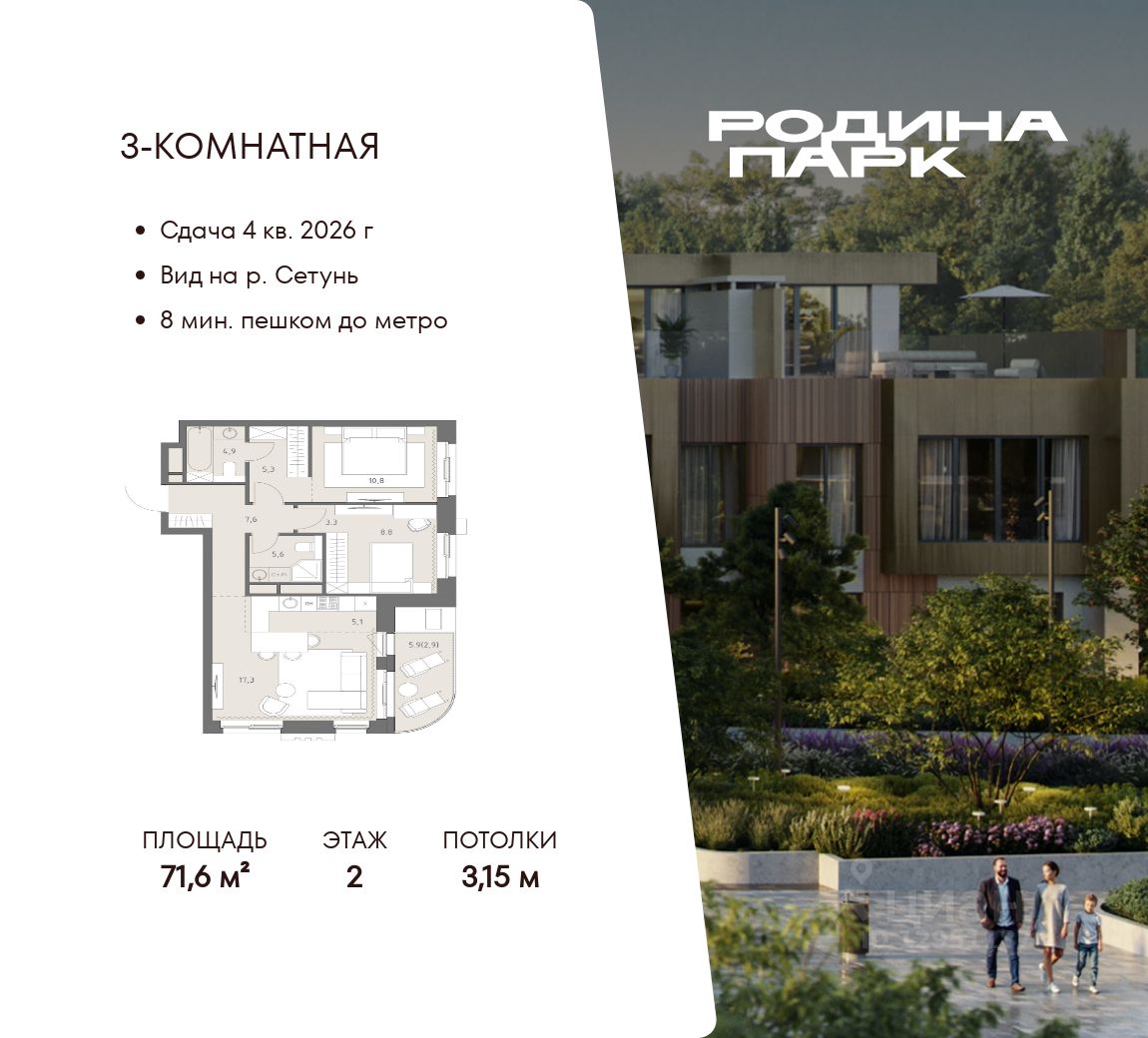 В жилом кластере Родина Парк рядом с природным заказником Долина реки Сетунь продаётся 3-комнатная квартира.