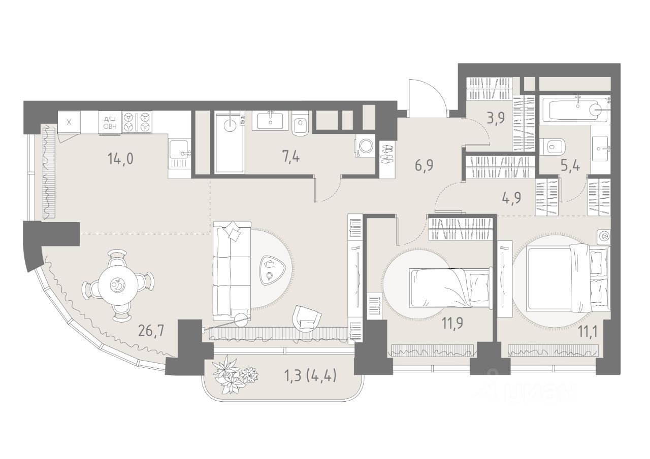 В жилом кластере Родина Парк рядом с природным заказником Долина реки Сетунь продаётся 3-комнатная квартира. Продуманная европланировка, которую легко зонировать под ваши запросы. Потолки от 3,1 м. "Родина Парк" — премиальный семейный кластер с образовательным медиакластером, строящийся на западе Москвы в окружении природного заповедника "Долина реки Сетуни". • Скидки недели на избранный пул лотов • Рассрочка 0% на выгодных условиях до 2 лет • Семейная ипотека, подбор комбо-вариантов ипотечных программ прямо в офисе продаж • Скидки 8% при 100% оплате или ипотеке. ЛОКАЦИЯ: 8 минут пешком до станции БКЛ "Давыдково". 12 минут на автомобиле до Нового Арбата. Удобные выезды на Кутузовский проспект, Аминьевское шоссе. ИНФРАСТРУКТУРА И СЕРВИСЫ ДЛЯ ЖИТЕЛЕЙ - Уникальная экосистема для развития, здоровья и творчества на территории 3,5 Га: - Первый в России образовательный медиакластер (с участием Русской медиагруппы) для творческого развития детей и взрослых с возможностью получить востребованную профессию в сфере шоу-бизнеса. - Инфраструктура и сервисы для семей с детьми на территории жилого кластера (частный детский сад, детские игровые пространства, творческие студии для занятий музыкой и танцами, безопасная и комфортная среда для детей и родителей), событийно-культурная площадка для проведения семейного досуга); - Здоровая среда (биохакинг-центр, фитнес-зал и спортивная инфраструктура во дворе, медитационные пространства, инженерные решения для освещения, свежего воздуха и очистки воды, сервисы красоты и поддержания активного долголетия); - Сервисы заботы (инфраструктура комфорта - подземный паркинг, кладовые, колясочные, консьерж- сервис, умный дом, мобильное приложение, профессиональная управляющая компания, сервисы охраны и обеспечение абсолютной безопасности) - Комьюнити резидентов (социальные пространства для дружеского и делового общения - летний атриум с уличным кинотеатром, зоны отдыха, кафе и рестораны, комьюнити-сервис с культурно- событийной программой в медиакластере); - Модуль благосостояния (комфортные пространства для работы и саморазвития - коворкинги и переговорные). ИНФРАСТРУКТУРА РАЙОНА: Насыщенная образовательная среда: филиалы МГИМО, МГУ, МГТУ, Сколково. Топовые школы: 6 лучших частных школ Москвы и области (Forbes) в 10 минутах езды. Природное окружение для пеших прогулок, спорта и отдыха. "Родина Парк" — это место, где растут и дети, и ваши возможности. Экосистема, где всё подчинено развитию — физически, профессионально, творчески.