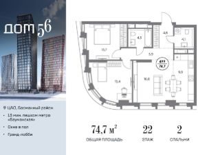 В премиум-квартале "Дом 56" на Бауманской напрямую от девелопера ГК "Галс-Девелопмент" представлена 2-комнатная квартира на 22 этаже общей площадью 74.70 м².