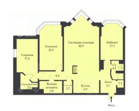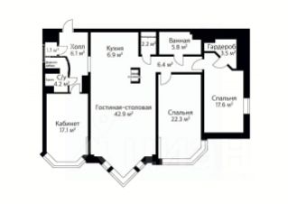 Две изолированные спальни 17,6-22,3 кв.м, кабинет 17,1 кв. м, гостиная 49,8 кв.м. с кухней в нише, прихожая 8 кв. м, два совмещенных санузла (один, гостевой, с душевой кабиной другой - с ванной), постирочная, две гардеробные. В каждой комнате кондиционер, дерево-алюминиевые окна.