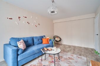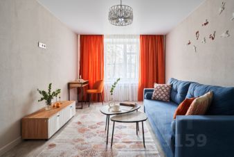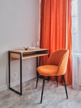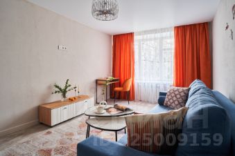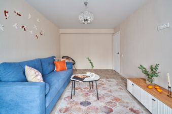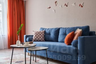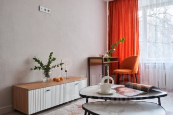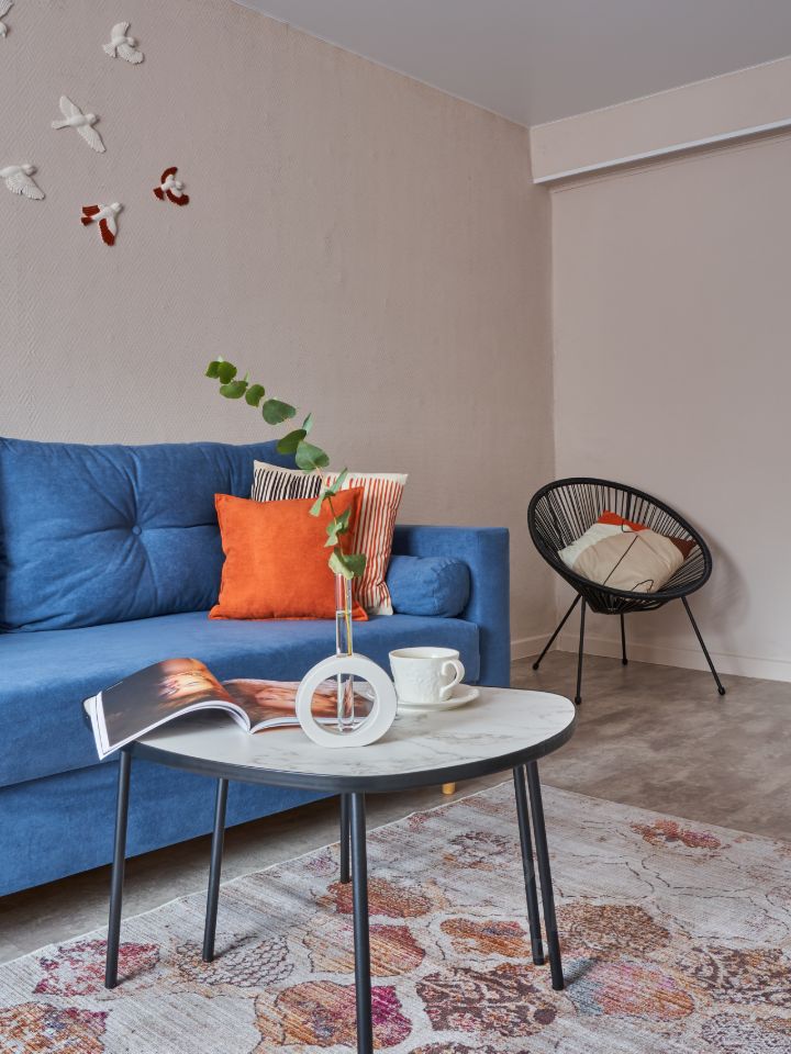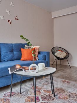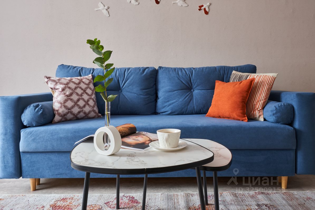 * В гостиной: двухместный раскладной диван, тумба, рабочая зона, кресло и журнальные столики