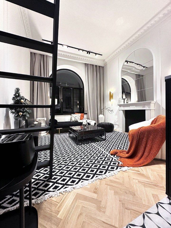 Стиль оформления студии: современная французская классика с элементами лепнины, натуральным деревянным паркетом, каминным порталом и стильным декором!