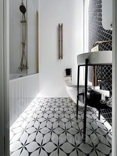Натуральный паркет на полу, ванная в светлой графичной плитке