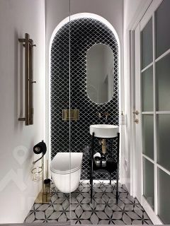 Ванная комната с инсталляцией, удобной ванной и утонченным гарнитуром