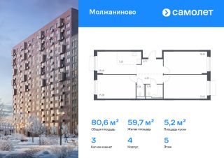 Строим кварталы для жизни с заботой о будущем. Предлагается 3-комнатная квартира комфорт-класса 80,62 кв.м в корпусе 4 на 5 этаже, в ЖК "Молжаниново"