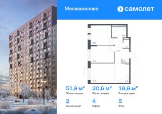 Строим кварталы для жизни с заботой о будущем. Предлагается 2-комнатная квартира комфорт-класса 51,89 кв.м в корпусе 4 на 5 этаже, в ЖК "Молжаниново"