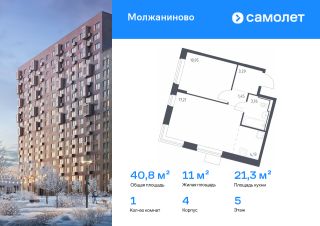 Строим кварталы для жизни с заботой о будущем. Предлагается 1-комнатная квартира комфорт-класса 40,79 кв.м в корпусе 4 на 5 этаже, в ЖК "Молжаниново"
