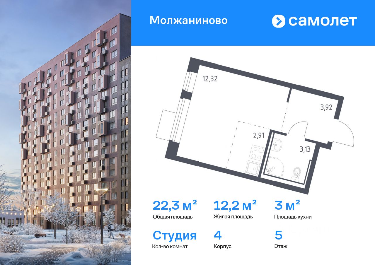 Строим кварталы для жизни с заботой о будущем. Предлагается квартира студия комфорт-класса 22,28 кв.м в корпусе 4 на 5 этаже, в ЖК "Молжаниново"