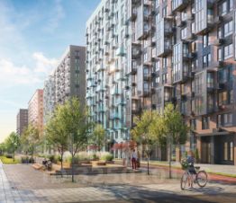 В квартале — монолитные дома комфортной высоты, от 10 этажей. Светлые фасады украшают кирпичные вставки в теплых природных оттенках.