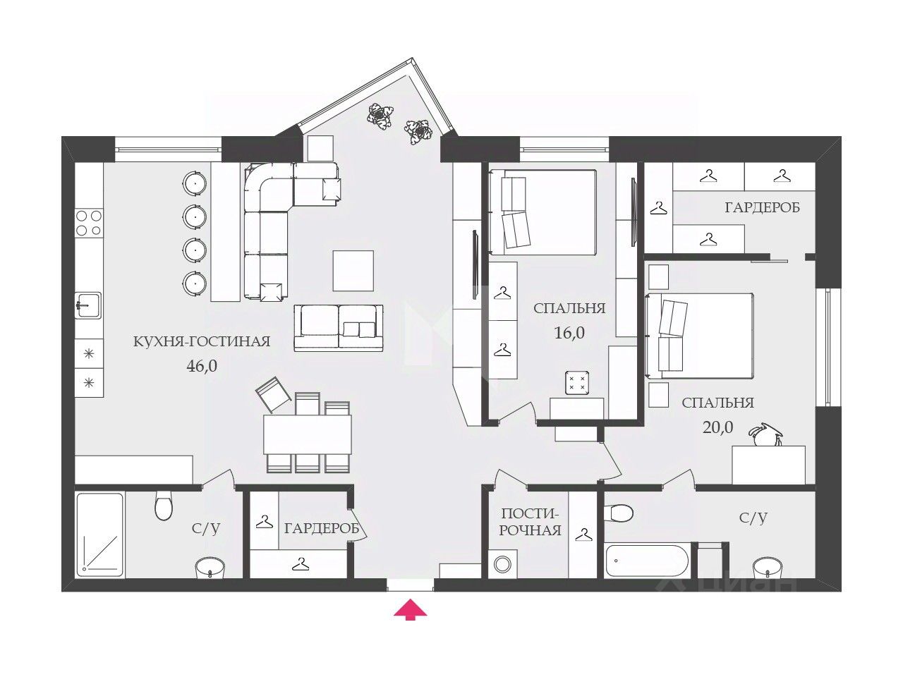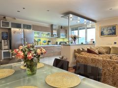 Функциональная планировка: две изолированные спальни одна из них с ванной и гардеробной комнатой, светлая кухня-гостиная с встроенной техникой. Два санузла: один с ванной, другой с душевой. Две вместительные гардеробные для хранения вещей, хозяйственный блок с постирочной. Вся встроенная мебель остаётся новым владельцам.