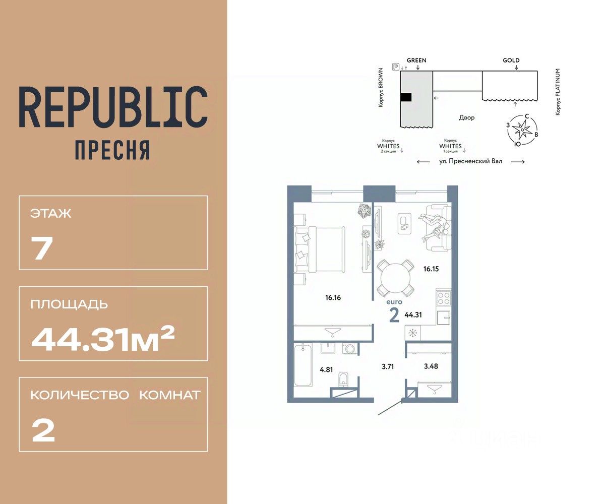 Продается 2комнатная квартира на 7 этаже от застройщика Страна Девелопмент. Площадь квартиры 44,31 кв. м.