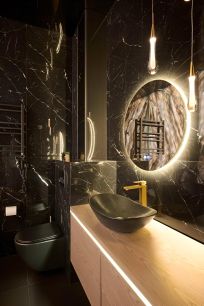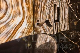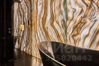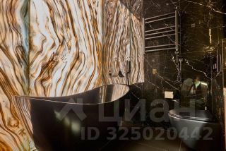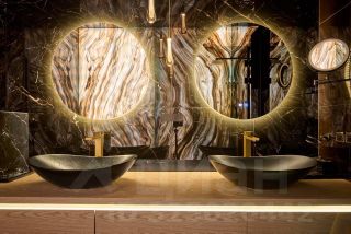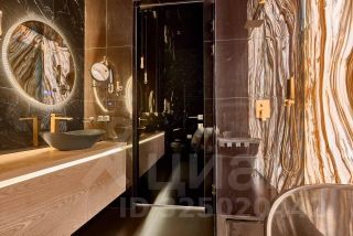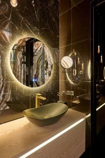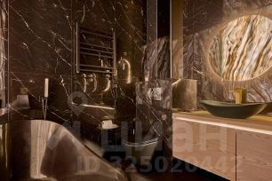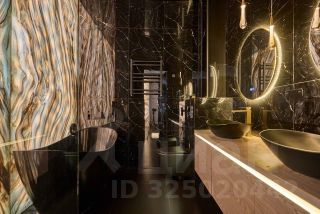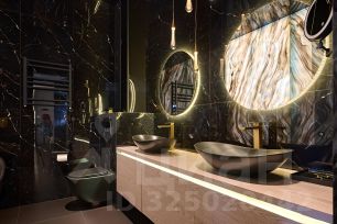 • Wellness-зона: Дизайнерский санузел с отдельно стоящей ванной, душевой кабиной и двойной раковиной. Отделка натуральным камнем в темных тонах создает атмосферу премиального спа.
