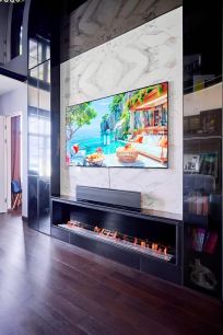 • Open-space гостиная: Просторная зона для отдыха и приема гостей, объединенная с кухней. Центральный акцент — мультимедийная зона с биокамином.