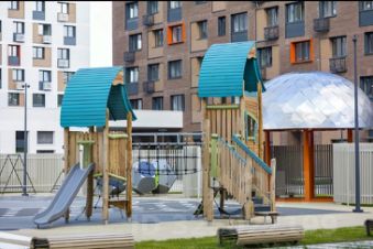Придомовая территория благоустроена игровыми и спортивными площадками, зонами отдыха с лавочками. Также зона Workout.