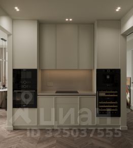 Просторная кухня-гостиная, укомплектованная полным набором бытовой техники Bosch, кофейной станцией и винным шкафом, а также мебелью на заказ;