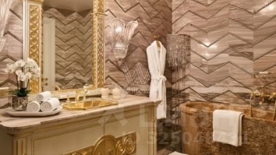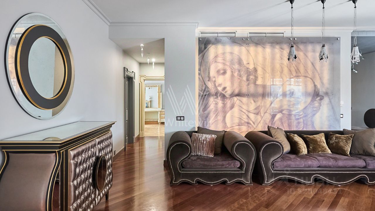 Планировка включает кухню-гостиную с обеденной зоной, две спальни, кабинет либо третью спальню, два санузла и вместительную гардеробную. Квартира укомплектована итальянской мебелью и техникой Miele. Установлена система центрального кондиционирования.