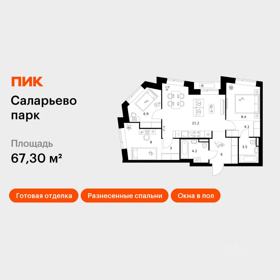 Продаётся 3-комн. квартира площадью 67,3 кв.м на 18 этаже 18 этажного дома (Корпус 74.6, Секция 6) проекта ПИК Саларьево парк. Светлый просторный подъезд на уровне земли, функциональная планировка, большие окна, c отделкой.