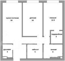 По планировке - просторная кухня-гостиная - 18м², детская 16м², взрослая спальня 12,5м² с гардеробной 3м², кабинет 5м², 2 санузла 6м² и 3м². Высота потолков 2.75, увеличенные окна.