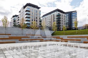 Территория жилого комплекса площадью 5 га благоустроена, проведены ландшафтные работы. На территории ЖК располагаются: кафе, фитнес-клуб с бассейном и СПА, детский сад, детская площадка, прогулочные зоны с маленькими фонтанами.