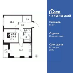 Продаётся 2-к квартира номер 613 общей площадью 55.6 кв.м. на 2-м этаже 18 этажного здания. Отделка Whitebox. Цена с учётом скидки.