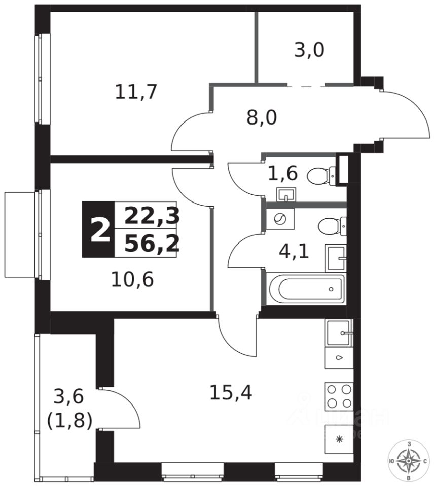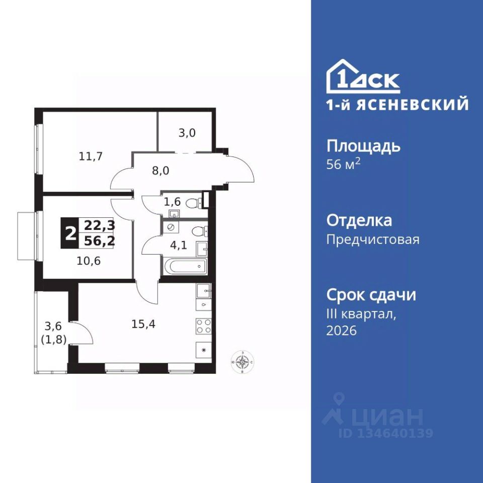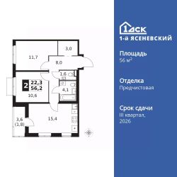 Продаётся 2-к квартира номер 668 общей площадью 56.2 кв.м. на 7-м этаже 18 этажного здания. Отделка Whitebox. Цена с учётом скидки.