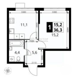 Квартира расположена на 7 этаже 18-этажного монолитного дома, который будет построен в 2026 году. Общая площадь квартиры — 36,3 кв. м, жилая — 15,2 кв. м, площадь кухни — 11,1 кв. м. Окна выходят на улицу. Квартира не угловая, комнаты изолированы.
