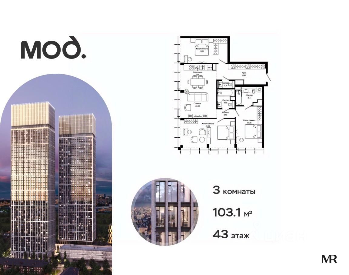 Продается 3-комнатная квартира общей площадью 103.10 м² без отделки в ЖК премиум-класса Мод на 43-м этаже 44 этажного дома.