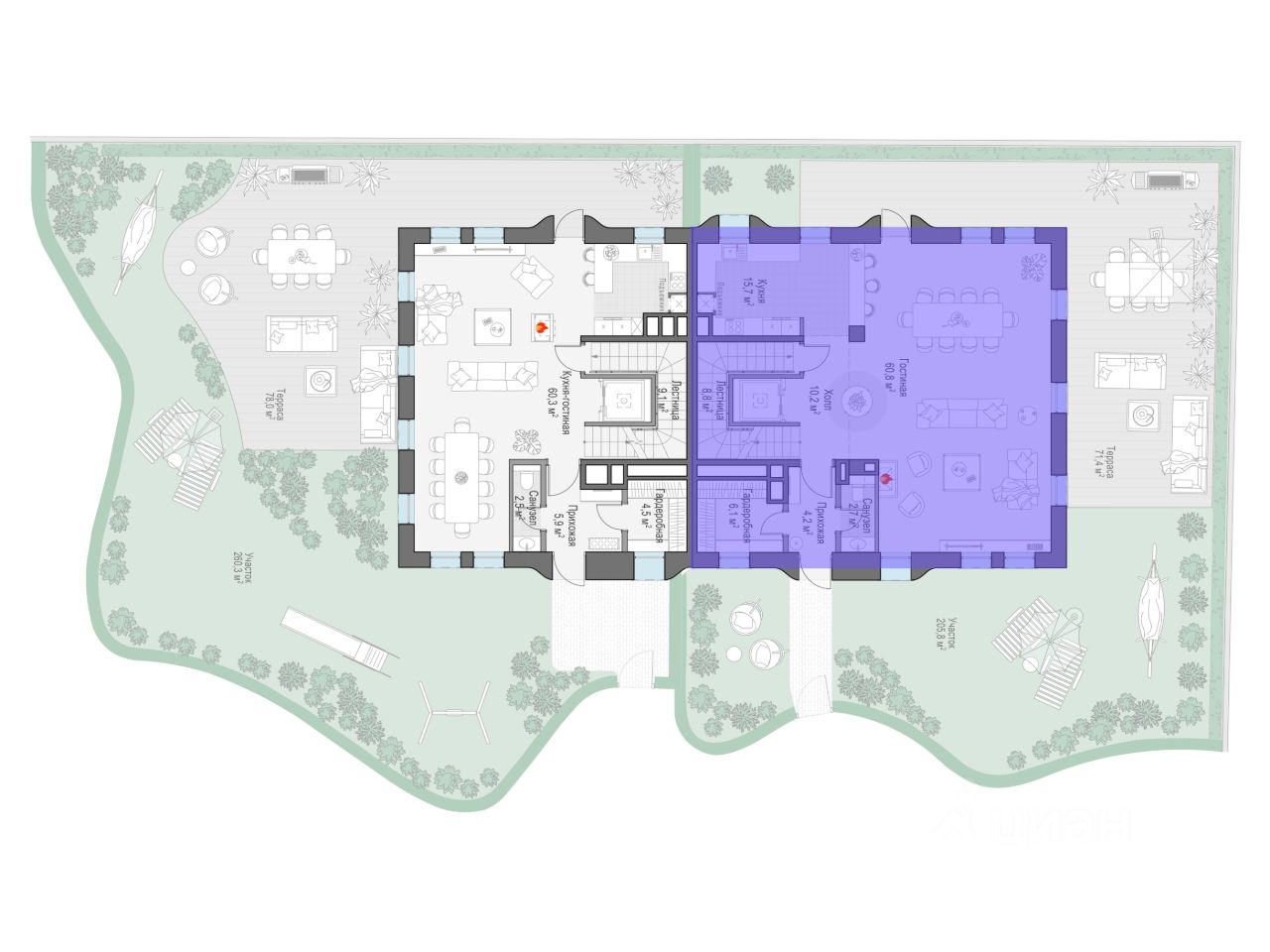 • Участок - 260 м² с частным патио - 77 м²