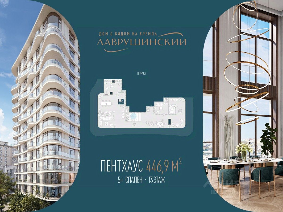 Двухэтажный пентхаус со вторым светом и высотой потолков до 7,9 м, общей площадью 447 м², расположен в восточном корпусе дома "Лаврушинский".