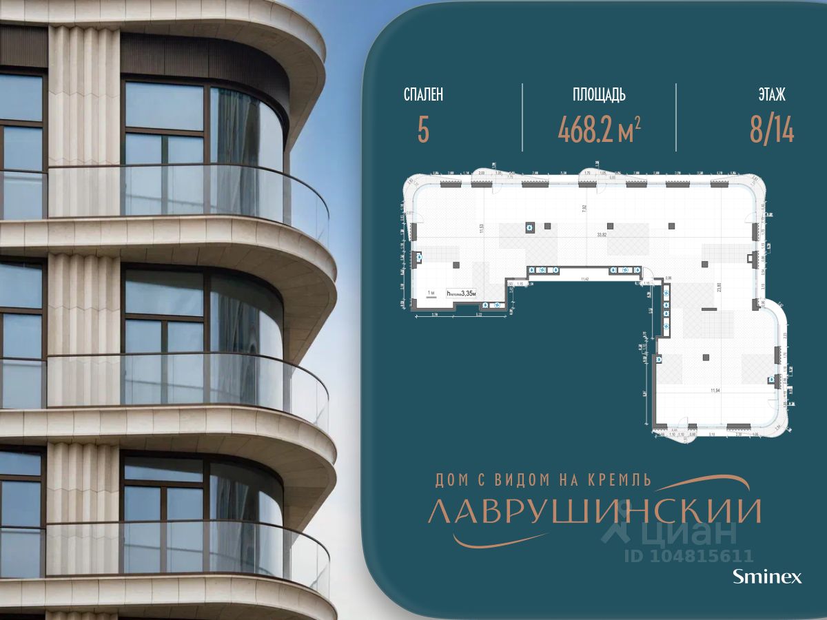 "Лаврушинский" - бескомпромиссный дом с лучшими видами на Кремль. Благодаря расположению всего в одном километре от Кремля, своей высоте и малоэтажной окружающей застройке, из квартир открываются поразительные прямые виды на главные достопримечательности центра Москвы, включая храм Христа Спасителя и собор Василия Блаженного. Расположение в глубине квартала, посередине парка, дает удивительное для центра ощущение тишины и простора. На закрытой территории находится самый большой на элитном рынке собственный ландшафтный парк площадью 1,4 га с фонтаном, ручьём, зонами для воркаута и тихого отдыха. KIDS LAB: развивающая детская площадка на улице и игровая комната в помещении. FIT LAB: фитнес-клуб с 25-метровым бассейном, beauty room, доступные только для жителей. В проекте уникальный выбор квартир с просторными балконами, пентхаусов с террасами, басcейнами и каминами, максимальными видовыми характеристиками, а также роскошных вилл. Всего - 153 квартиры и 101 продуманное планировочное решение. Высота потолков составляет от 3,5 до 8,25 м. В доме предусмотрен 2х-уровневый паркинг на 279 машино-места. В доме предусмотрен полный комплекс систем комфорта, включающий приточно-вытяжную вентиляцию с тонкой фильтрацией с принципом забора воздуха с высоты 50 метров для повышения продолжительности жизни, отдельный сервисный лифт для обслуживающего персонала и другие современные системы.