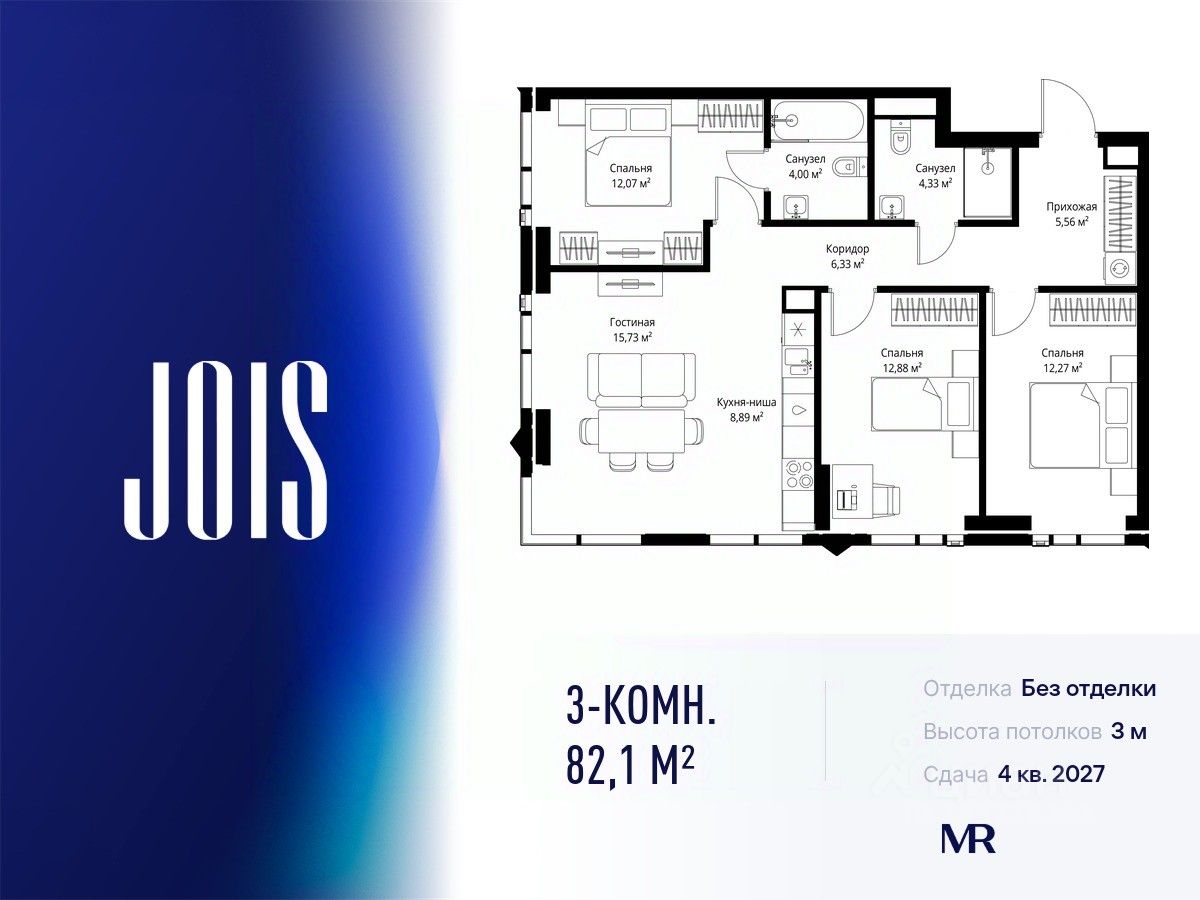 В продаже квартира площадью 82.06 м² без отделки на 33 этаже 46 этажного дома. Квартира расположена в корпусе Leo.