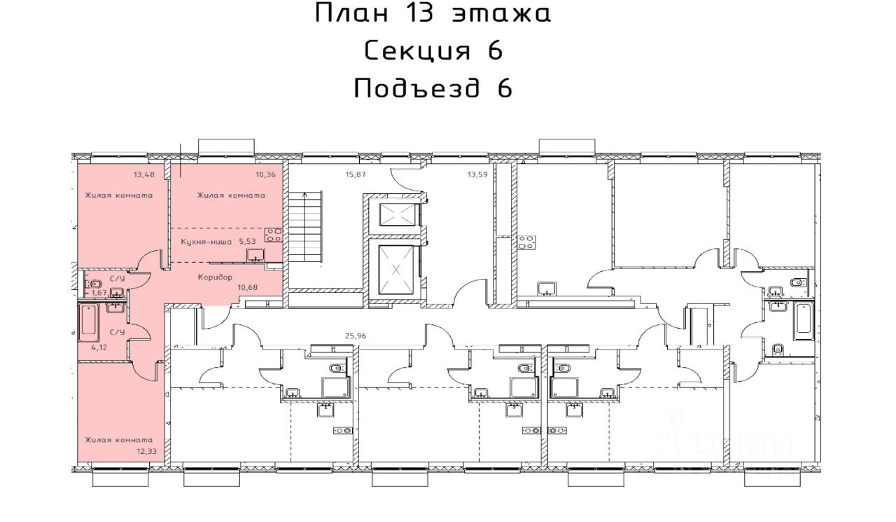 - две изолированные комнаты 13,48 кв. м. и 12,33 кв. м.;