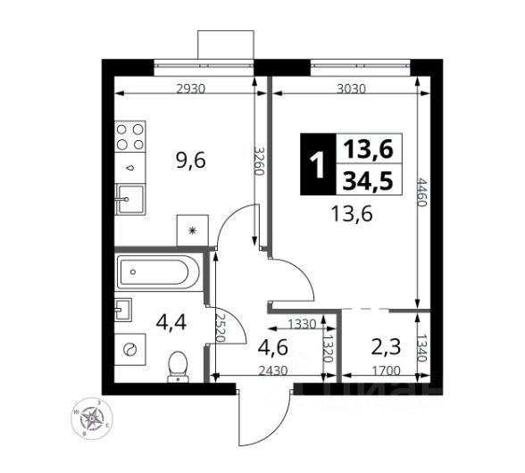- Площадь квартиры: общая — 34 кв.м., жилая зона — 13,5 кв.м. плюс удобная гардеробная 2,3 кв.м., просторная кухня площадью 10 кв.м. и совмещённый санузел