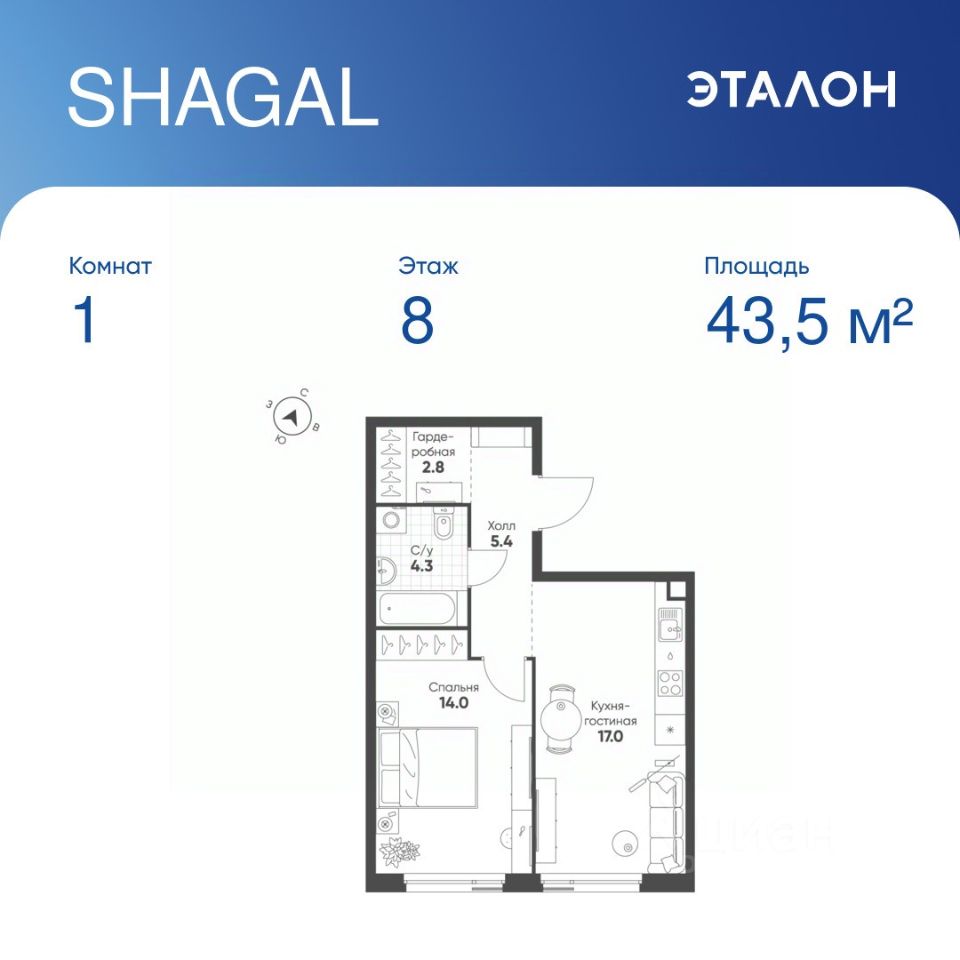 Общая площадь квартиры — 43.5 кв. м, этаж 8 из 8.