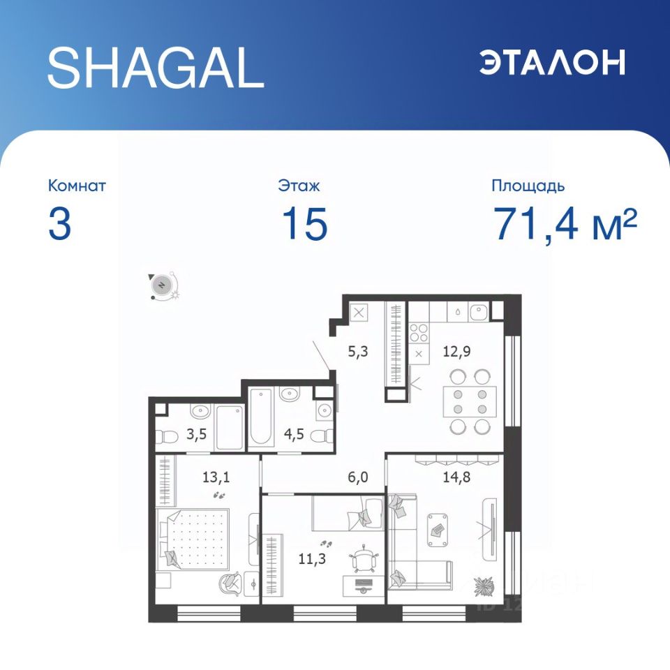 Общая площадь квартиры — 71.4 кв. м, этаж 15 из 19.
