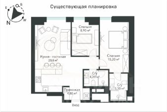 Планировкой предусмотрена кухня-гостиная (29,8м²), мастер-спальня (15,2м²) c ванной (5,3м²), детская или кабинет (8,9м²), а также гостевой с/у c душем (4,2м²) и холл (4,8м²) c двумя нишами под шкафы.