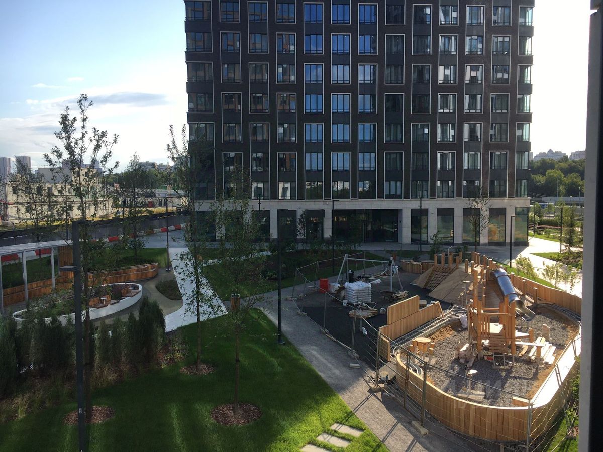 Внутренний двор ЖК благоустроен цветниками, приватными зонами в окружении многолетних деревьев и кустарников, спортивными площадками, детскими площадками с многочисленными игровыми постройками.