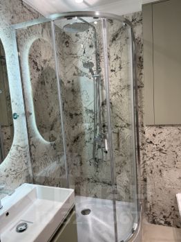 В душевой установлена импортная душевая сантехника и стиральная машина, гарантирующие долговечность и надежность.