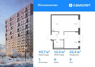 Строим кварталы для жизни с заботой о будущем. Предлагается 1-комнатная квартира комфорт-класса 43,68 кв.м в корпусе 6 на 5 этаже, в ЖК "Молжаниново"