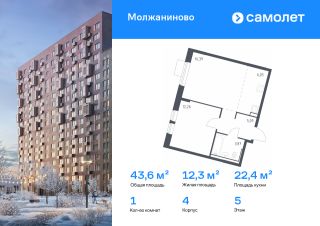 Строим кварталы для жизни с заботой о будущем. Предлагается 1-комнатная квартира комфорт-класса 43,64 кв.м в корпусе 4 на 5 этаже, в ЖК "Молжаниново"